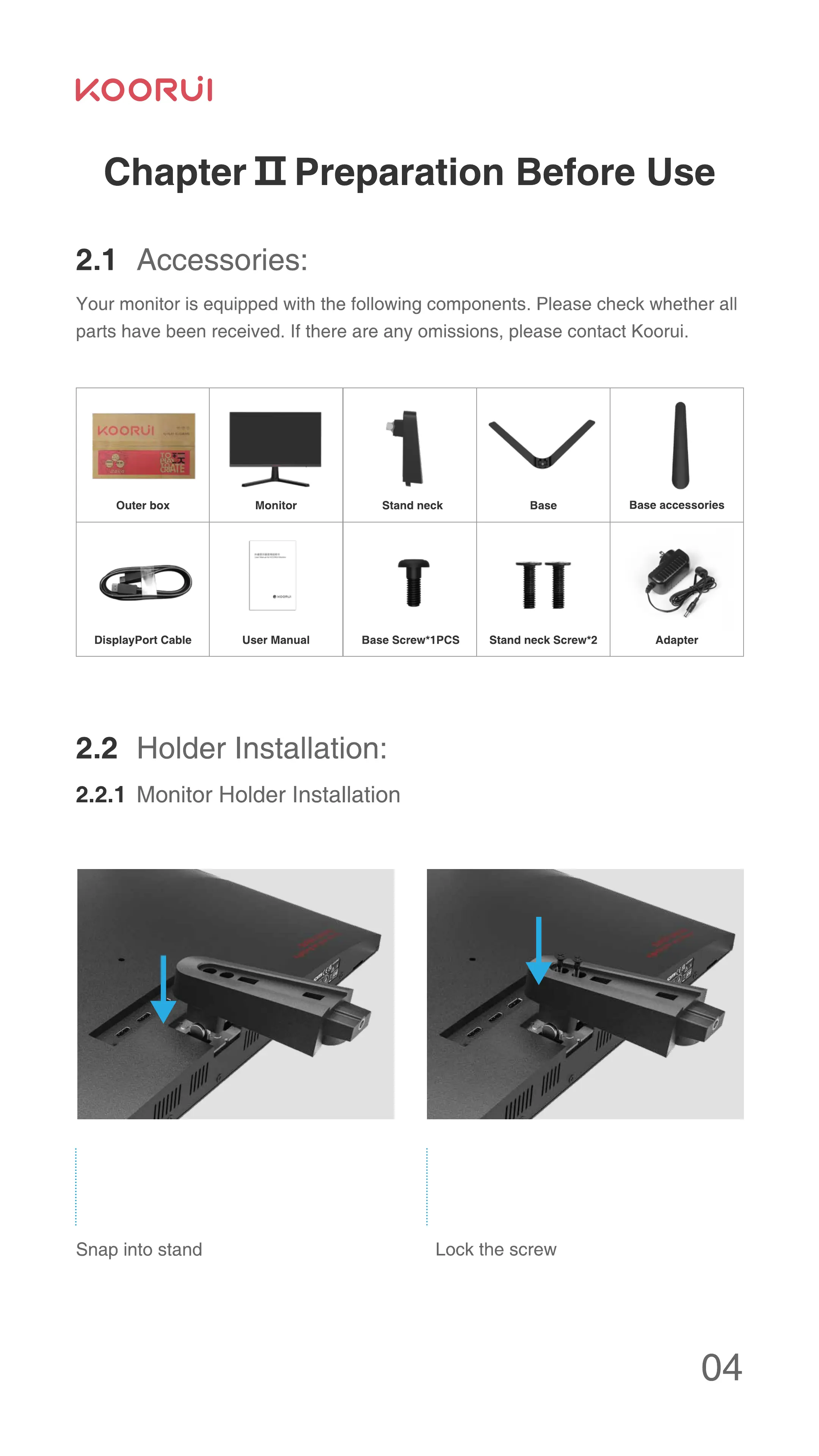 parts have been received. If there are any omissions, please contact Koorui.