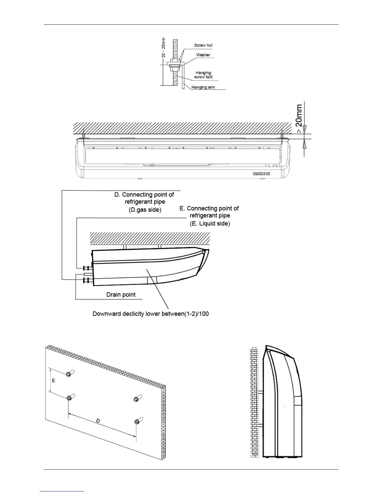 Hang the indoor unit by insert the tapping screws into the hanging arms on the main unit. (The bottom of