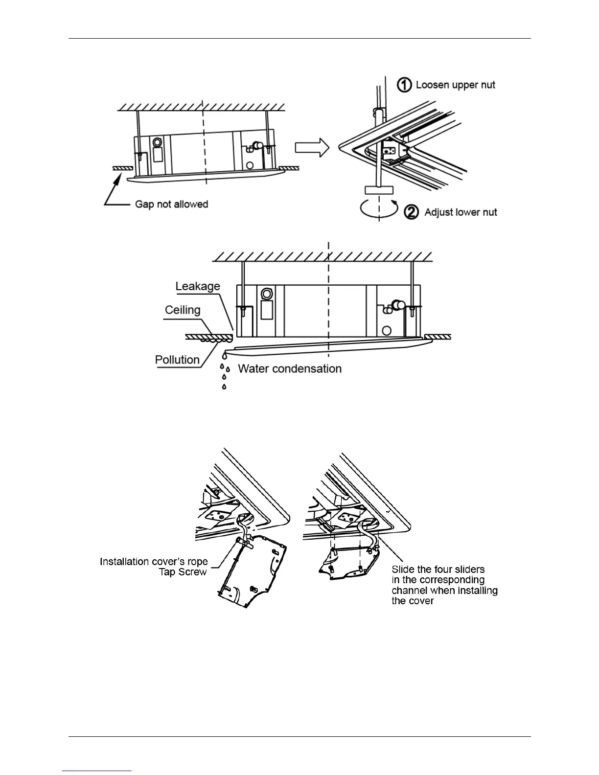 Tighten the screws under the panel hooks till the panel closely stick on the ceiling to avoid condensate