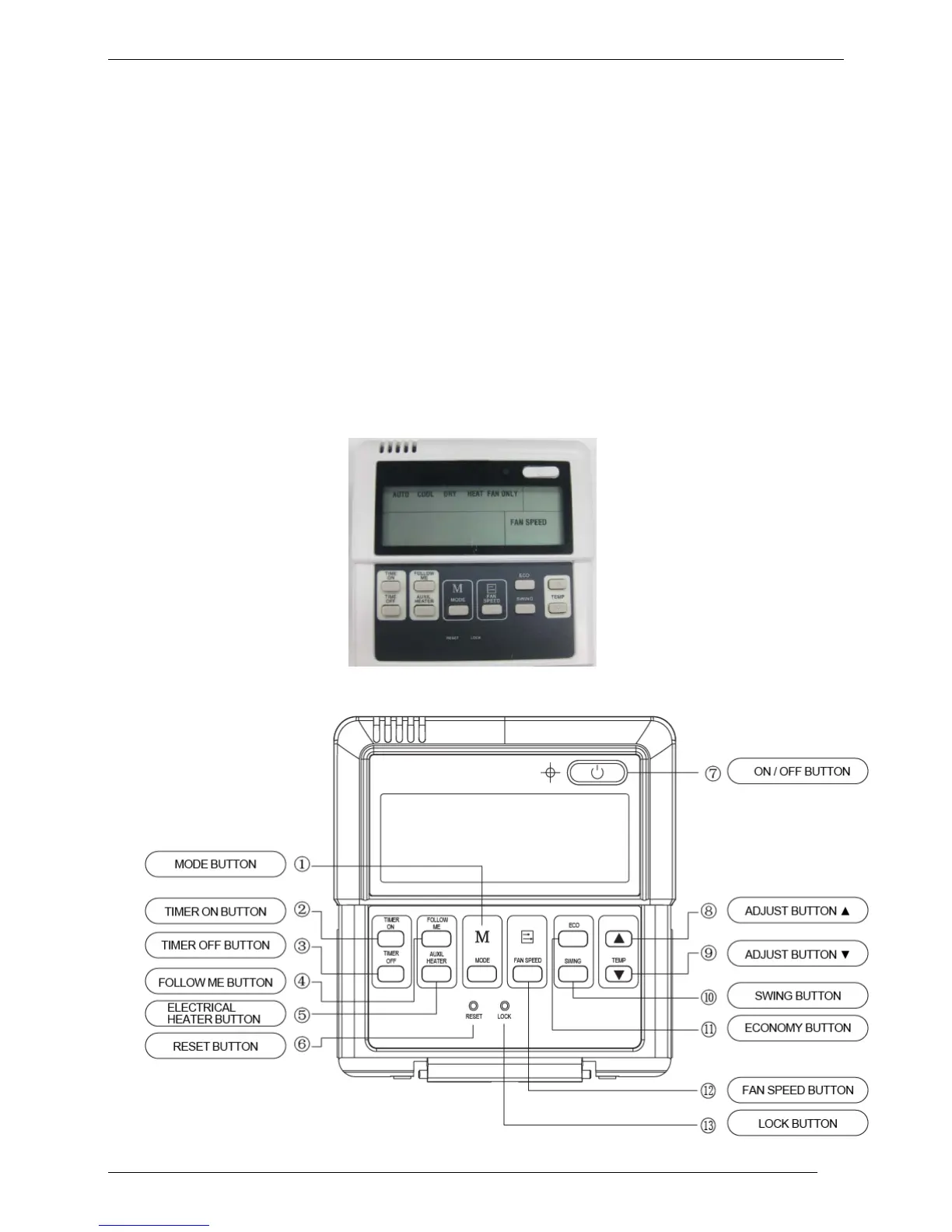 13. LOCK (inner located): Push this button to lock in all the current settings, and the remote controller will