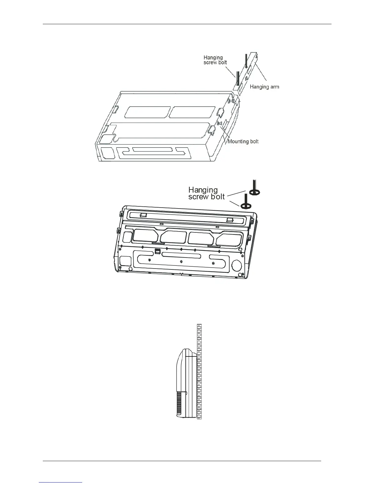 Hang the unit on the hanging arm by sliding backward. Securely tighten the mounting bolts on both sides.