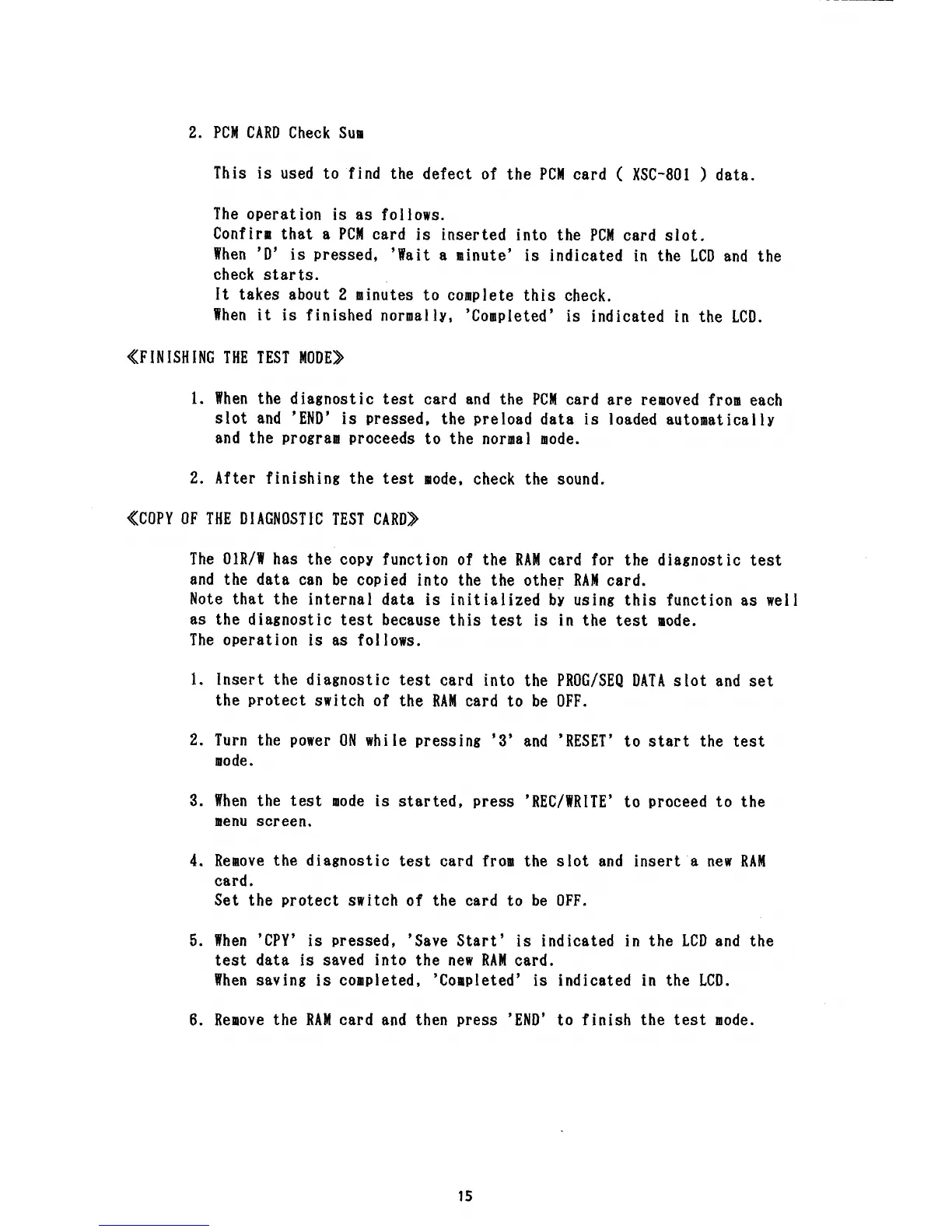 Korg 01R/W - Finishing the Test Mode; PCM Card Check Sum; Copy of the Diagnostic Test Card