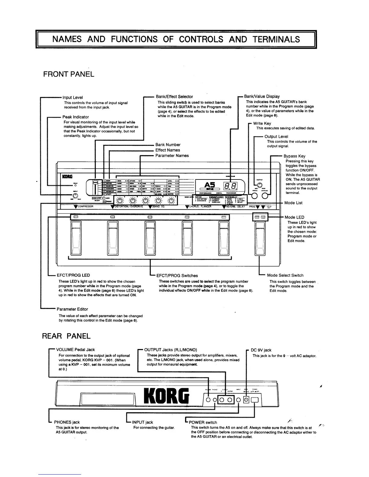 Korg A5 Guitar - Names and Functions of Controls and Terminals; Front Panel; Rear Panel