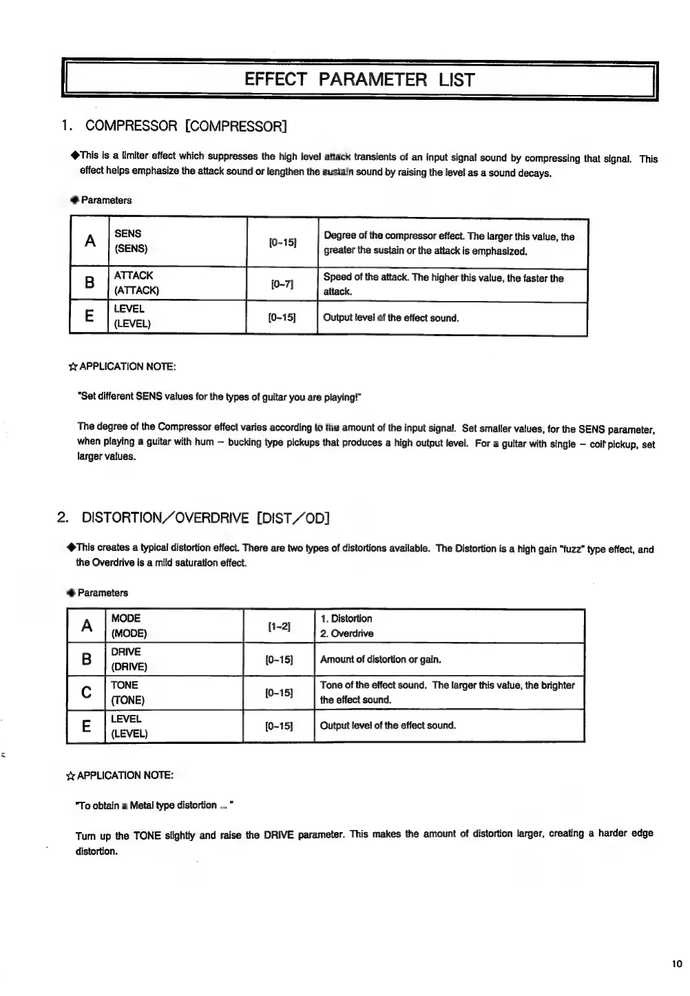 Korg A5 - Effect Parameter List