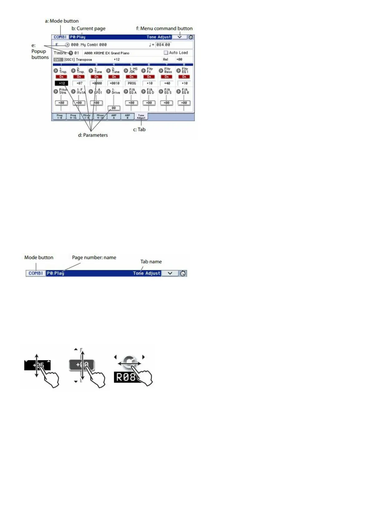 When you press a popup button, the available parameter values will appear as a popup menu or a tabbed menu.