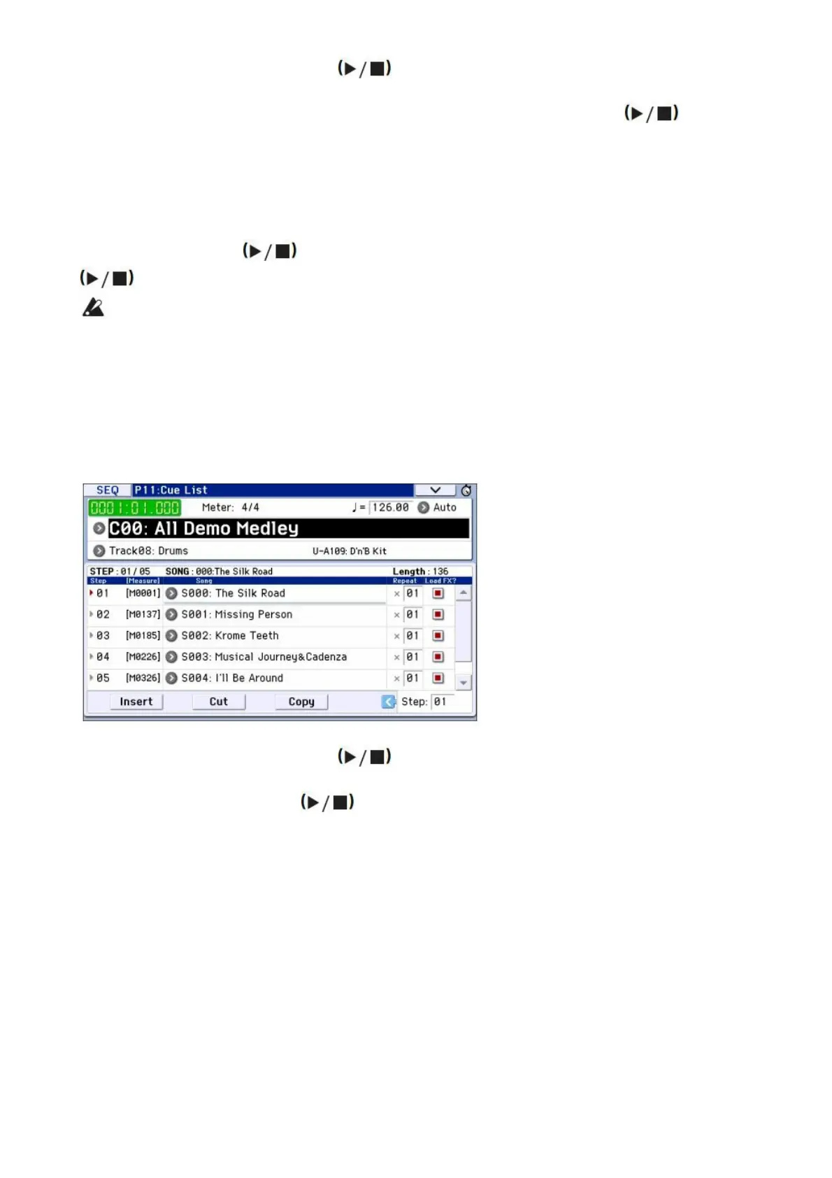 times that each song will be repeated. Here’s how to play back the demo songs that are assigned to a cue list.