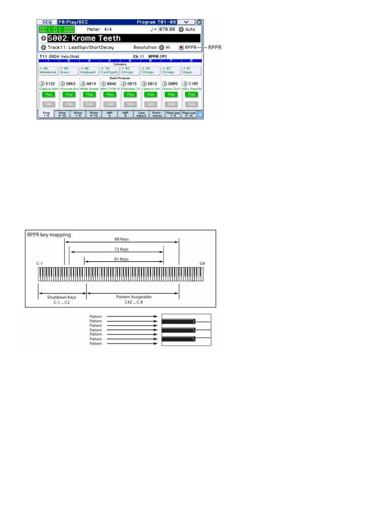 be assigned to each of the seventy-two keys C#2C8 (indicated in the illustration as Pattern Assignable). Keys that