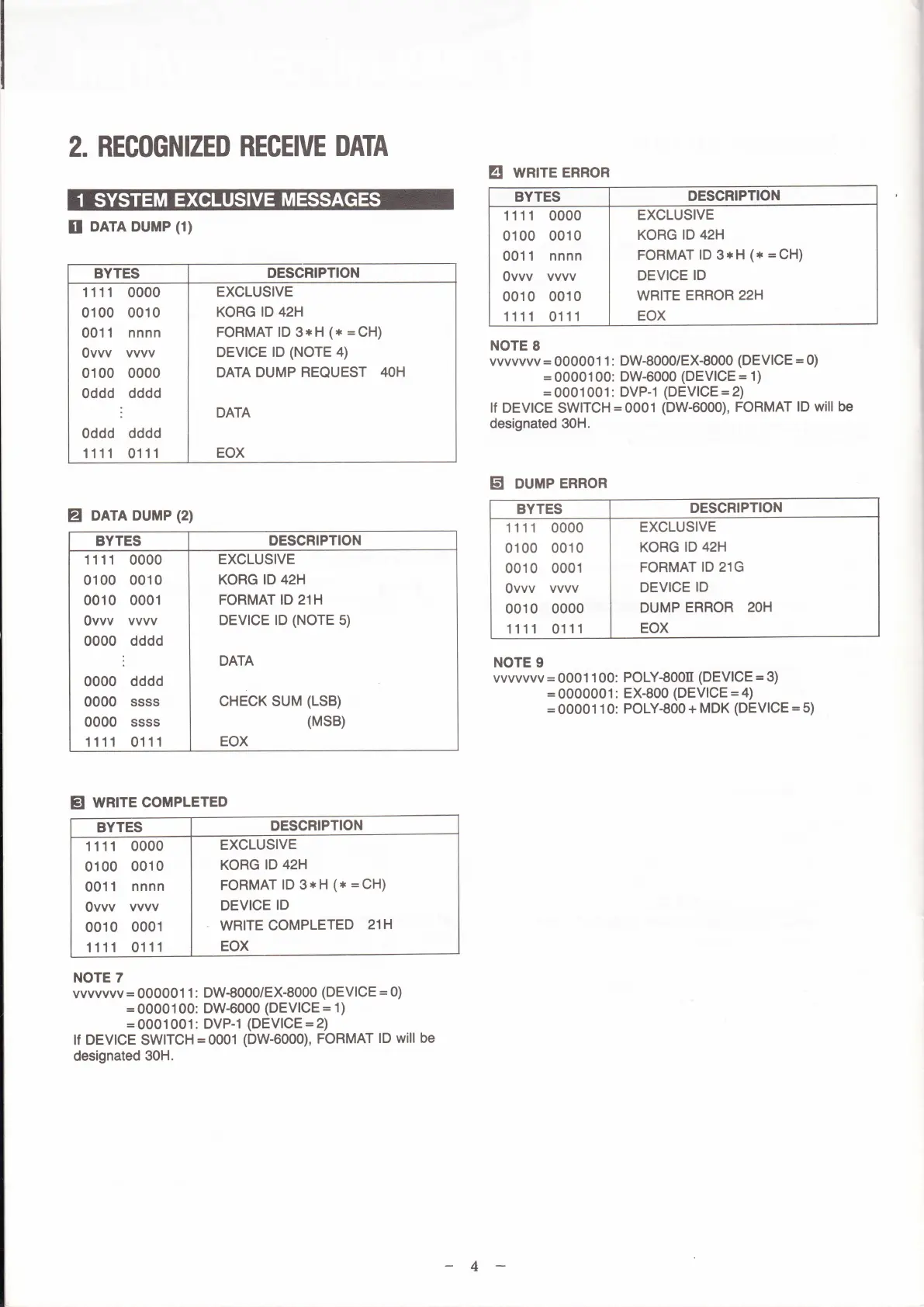 Korg MEX-8000 - Korg MEX-8000 Recognized Receive Data; System Exclusive Messages; Data Dump Type 2 Reception; Write Completed Message