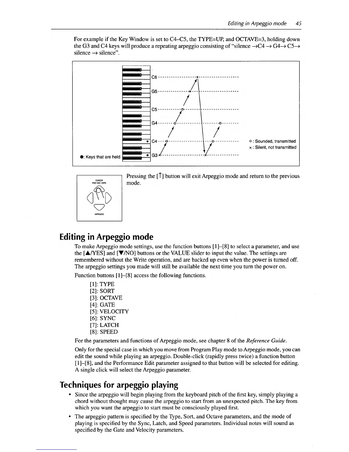 Korg N264 - Editing and Playing Arpeggios; Editing in Arpeggio mode; Techniques for arpeggio playing