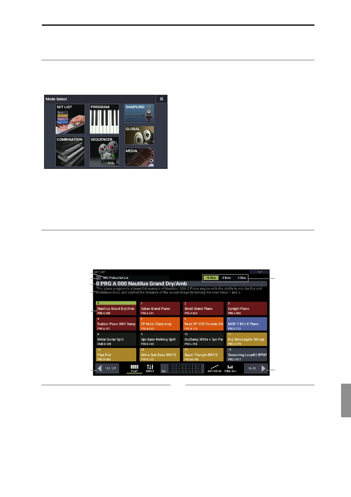 Korg NAUTILUS 88 - 演奏する; モードを選ぶ; セット・リストを演奏する