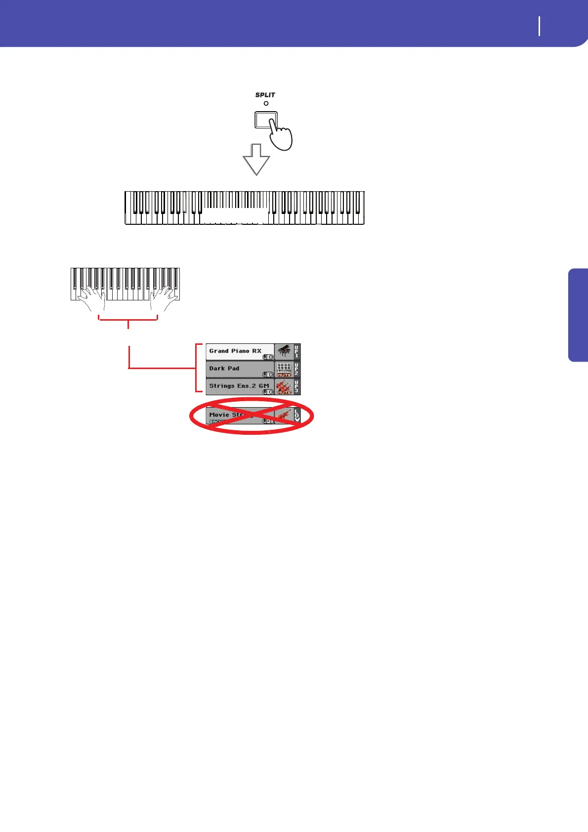 4 Return to the full keyboard playing mode by pressing the SPLIT button to turn its LED