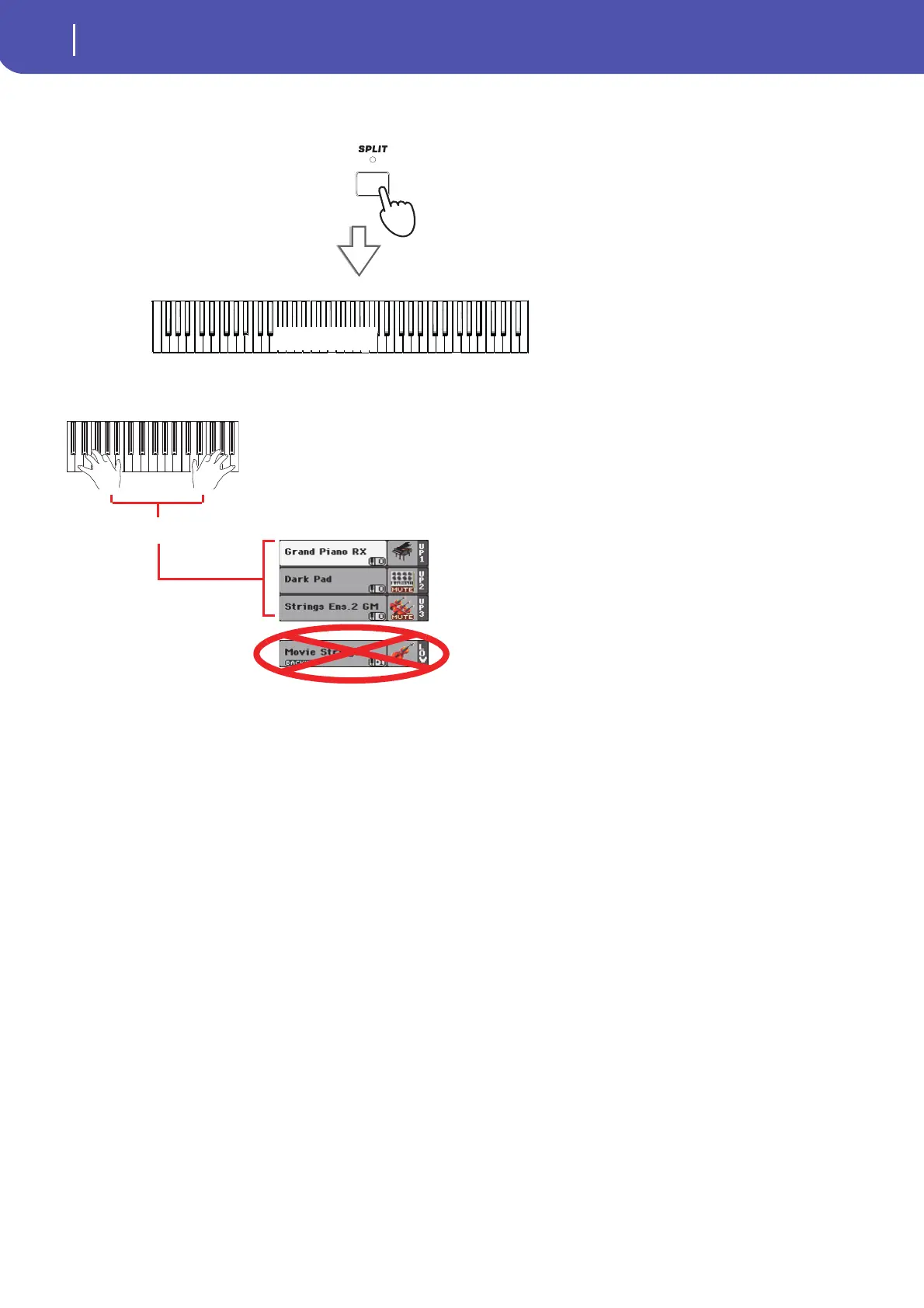 4 Return to the full keyboard playing mode by pressing the SPLIT button to turn its LED