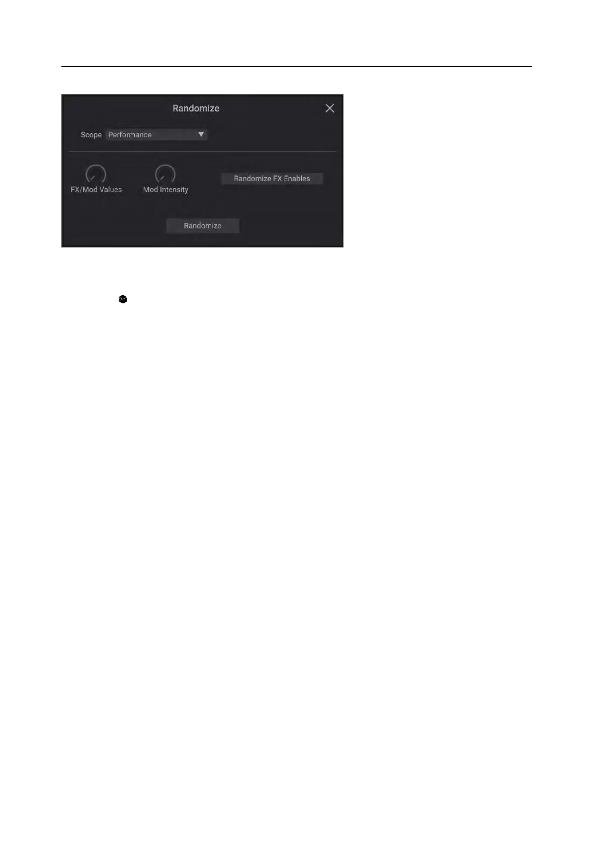 Fx/Mod Knob Values randomizes the Mod Knobs (Program and/or Performance, according to Scope) and Eects
