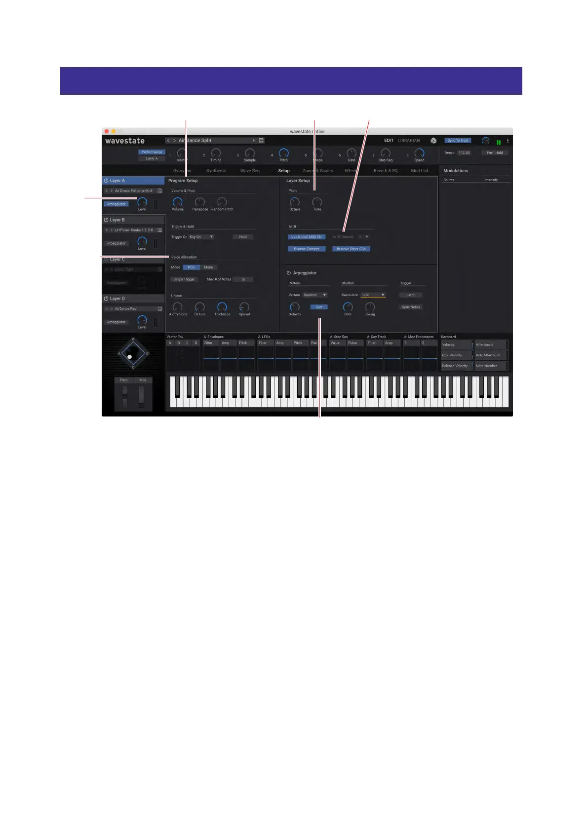 Each Layer has its own Arpeggiator. Since this is in the Layer, you can leave the Arpeggiator set up and audition it with