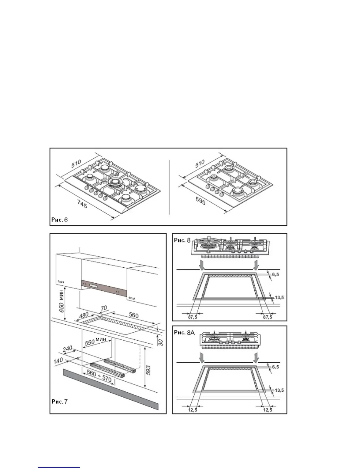 745 x 510 мм) или рис. 8A (для варочных панелей 595 x 510 мм). Убедитесь, что края