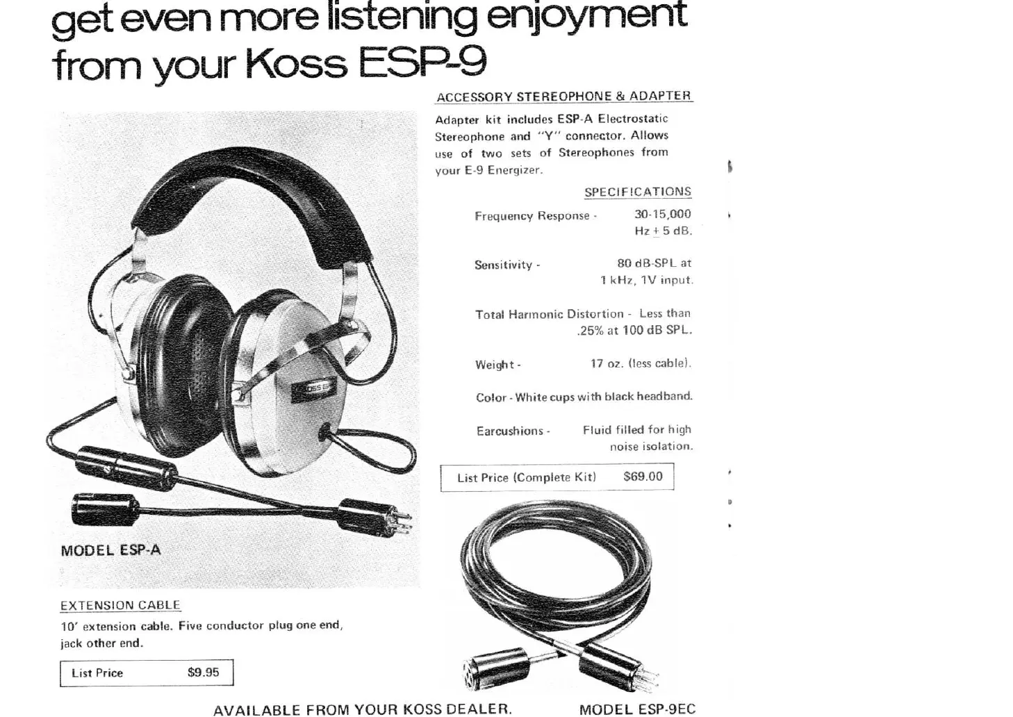 Koss ESP-9 - Available Accessories; Accessory Stereophone and Extension Cable