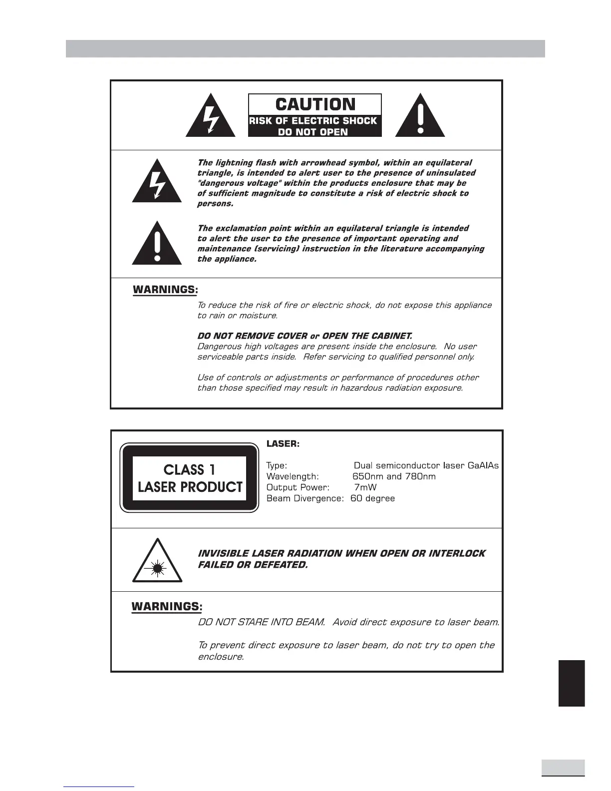 Koss KS3101A-2 - Safety Precautions; Electrical, Laser, and General Warnings