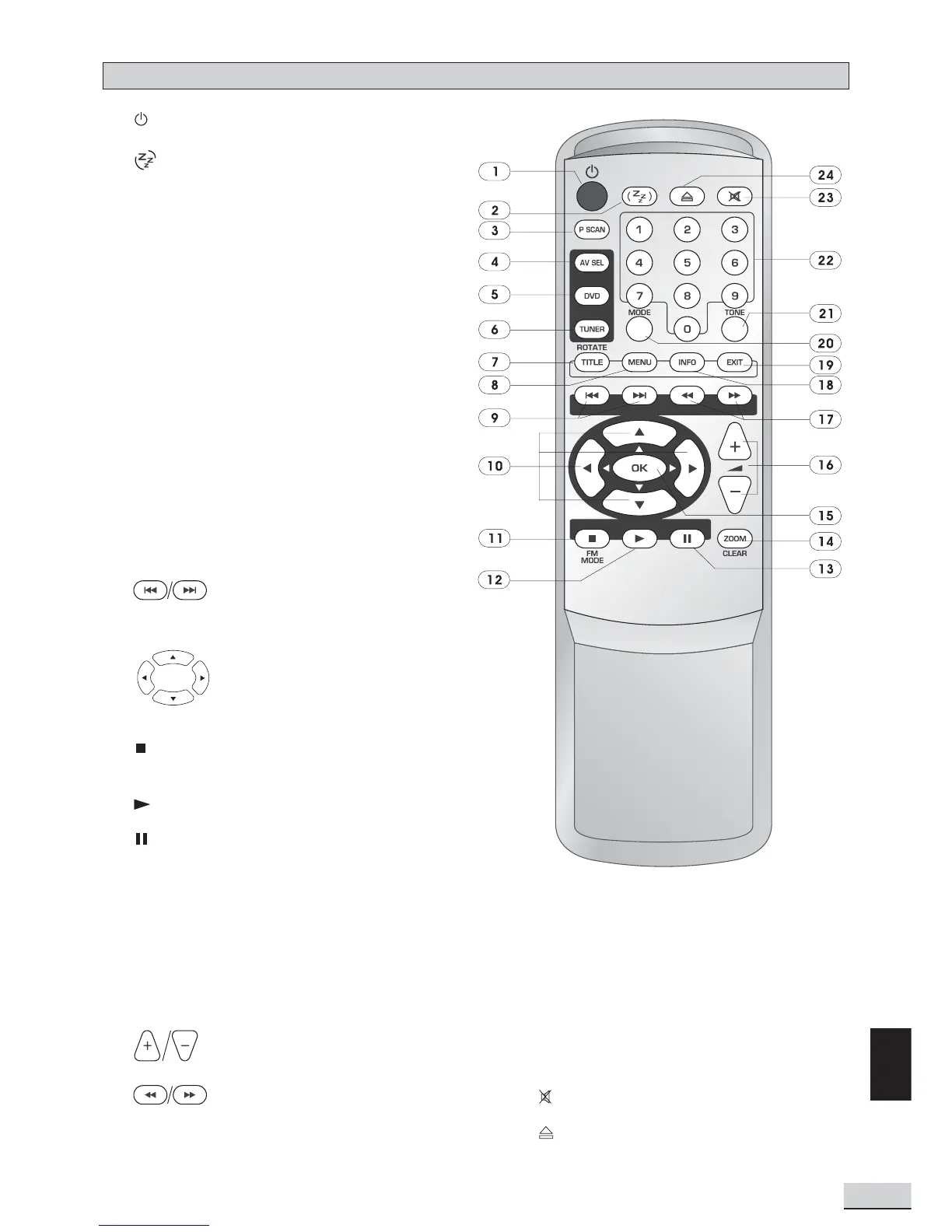 20. MODE selects surround modes or soundfield