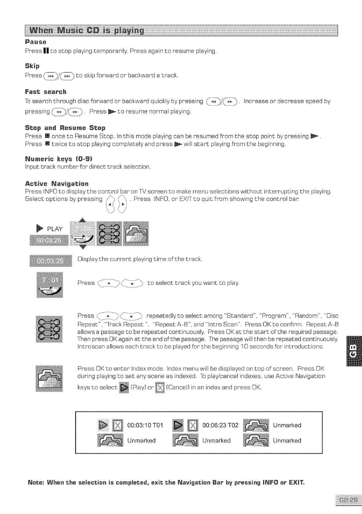 Press iNFO to display the control bar on qX/screen to make menu selections without interrupting the playing.