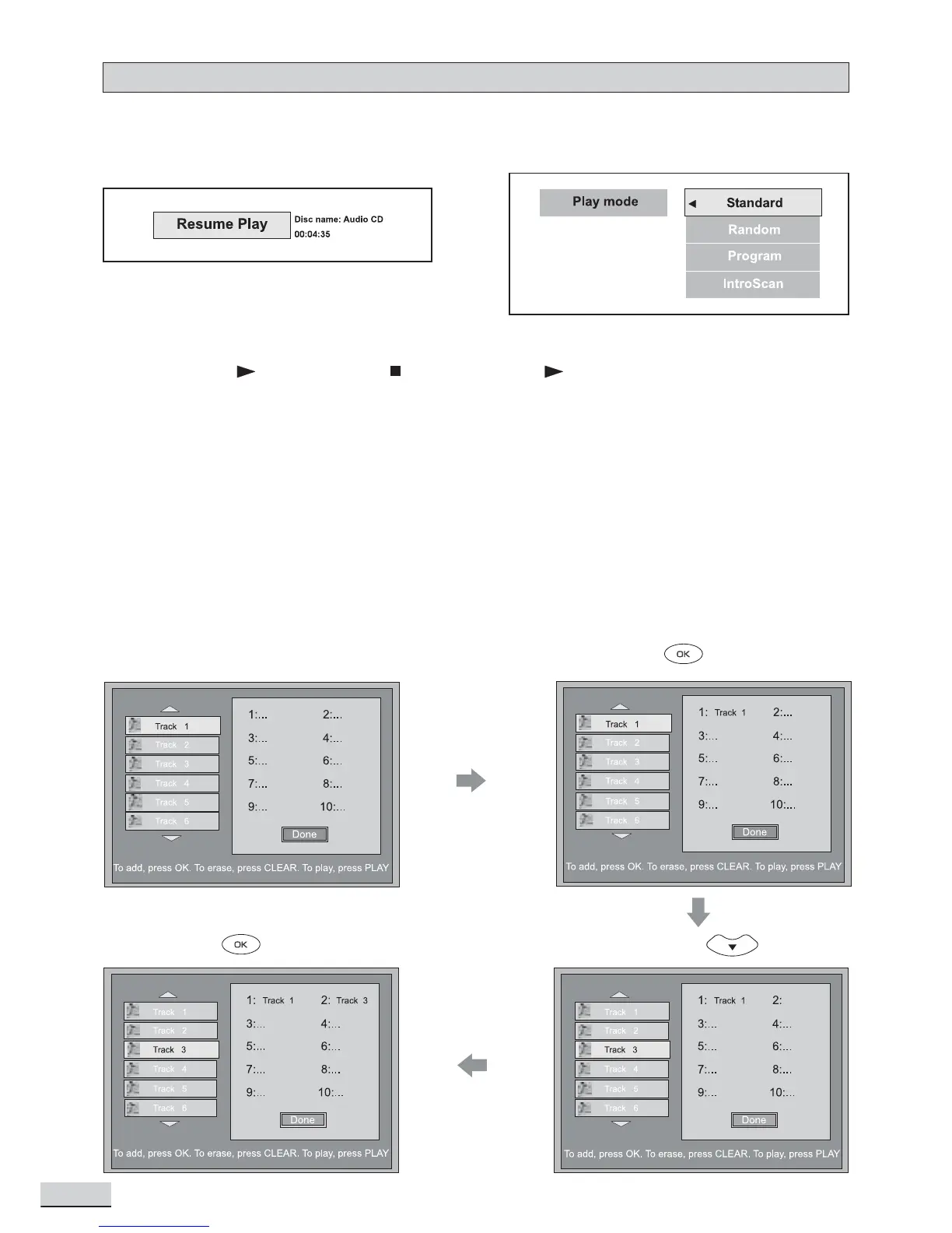 Press OK to play the first 10 seconds of each track on disc.