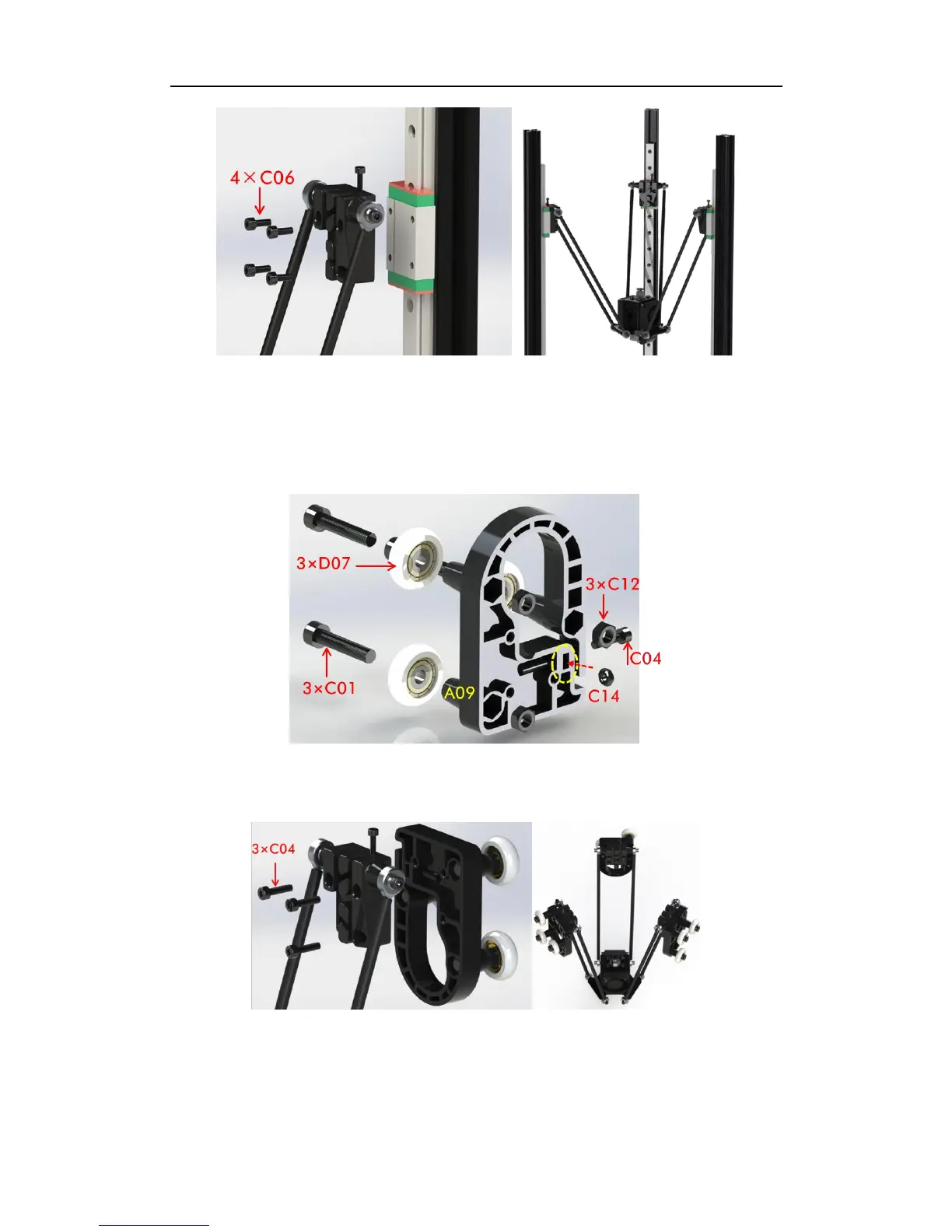 Step 1. As shown in Fig. 15, fix 3 pulley wheels (D07) to the carriage (A09) using 3 pairs of