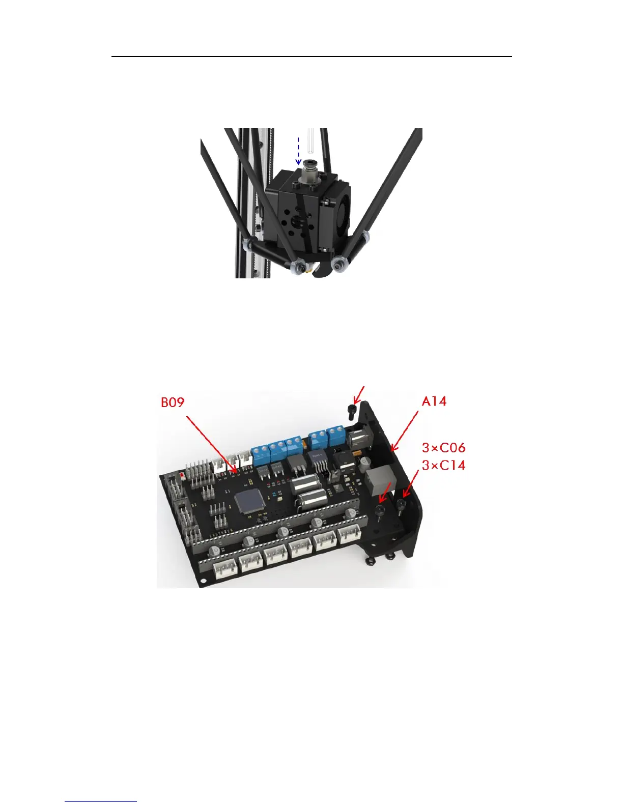 Step 1. Fix ANYCUBIC mainboard (B09) to the holder (A14) using 3 pairs of C06 and C14.
