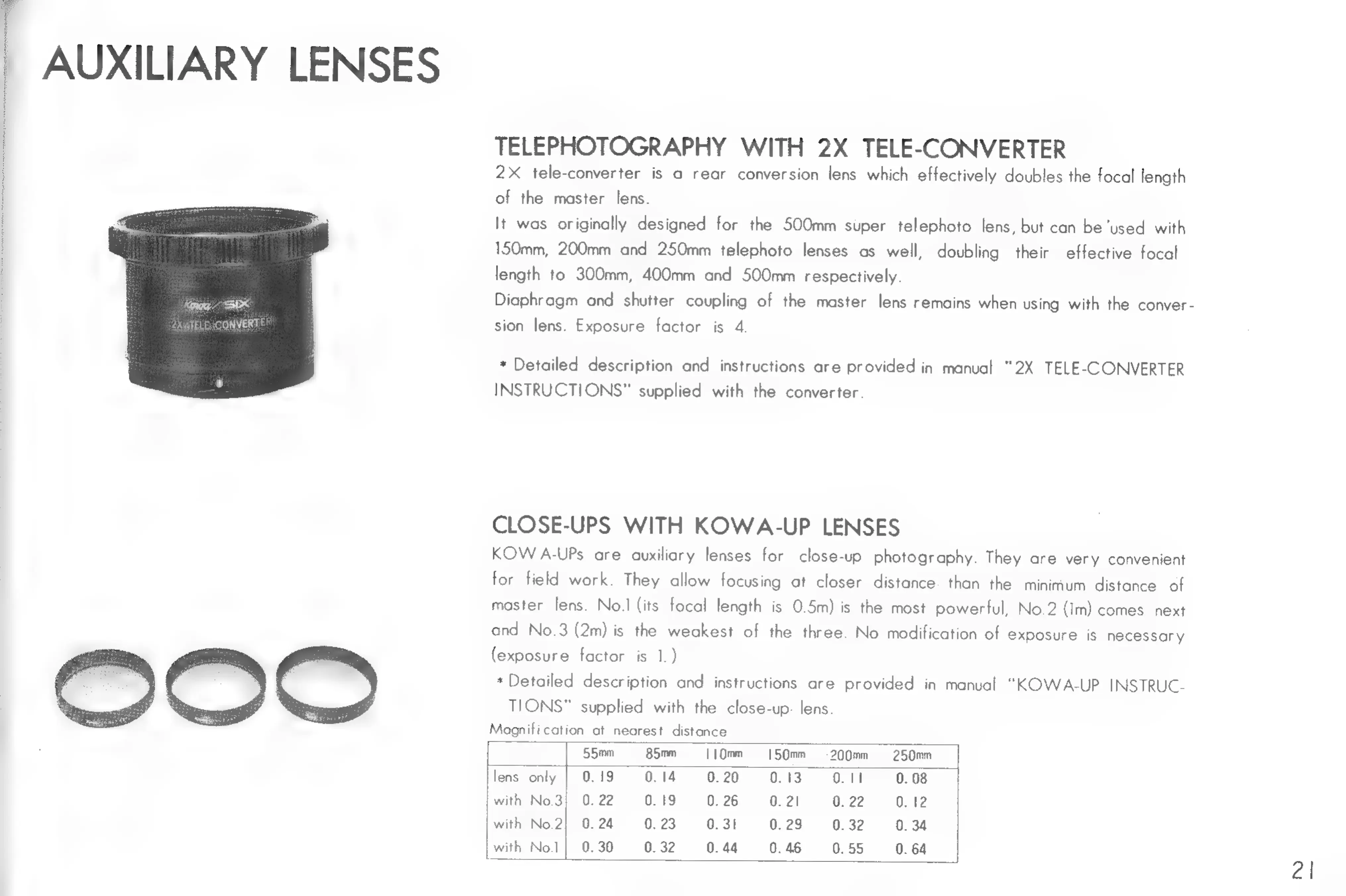 Kowa SIX Version II - Kowa Six Auxiliary Lenses; Telephotography with 2 X Tele-Converter; Close-ups with Kowa-Up Lenses