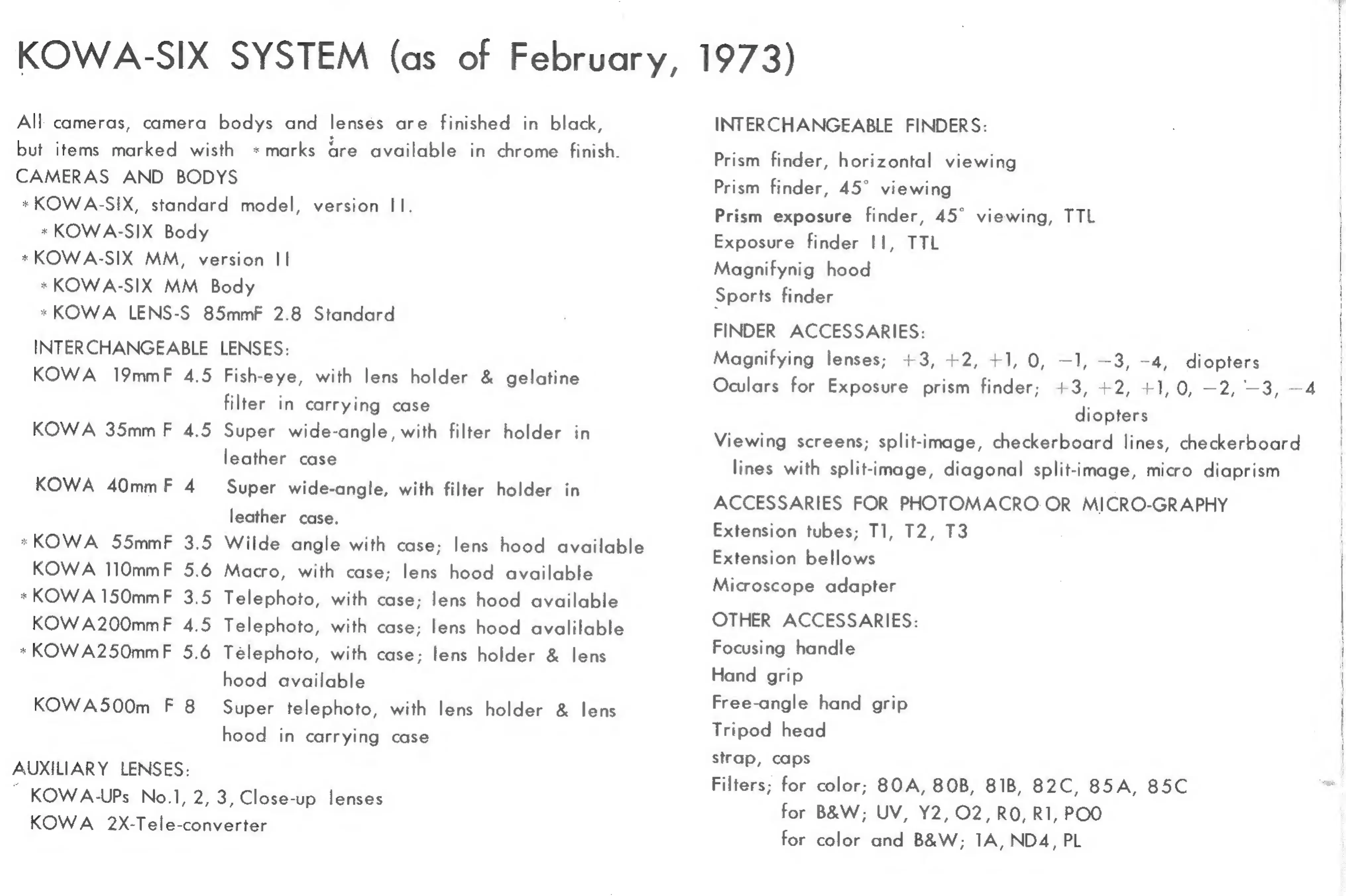 Kowa SIX Version II - Kowa Six System Overview; Kowa Six Cameras and Bodys; Kowa Six Interchangeable Lenses; Kowa Six Auxiliary Lenses