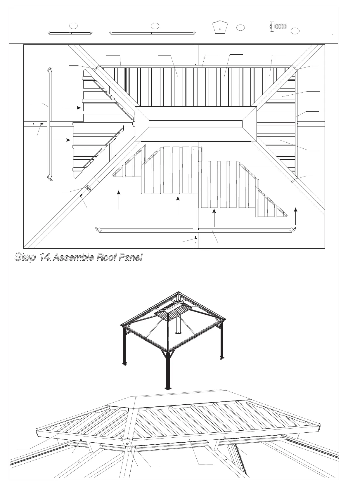 1. Push the Roof Panels (Part V11, V12, V43, V44, V45,V46) up to the upper roof as shown in the