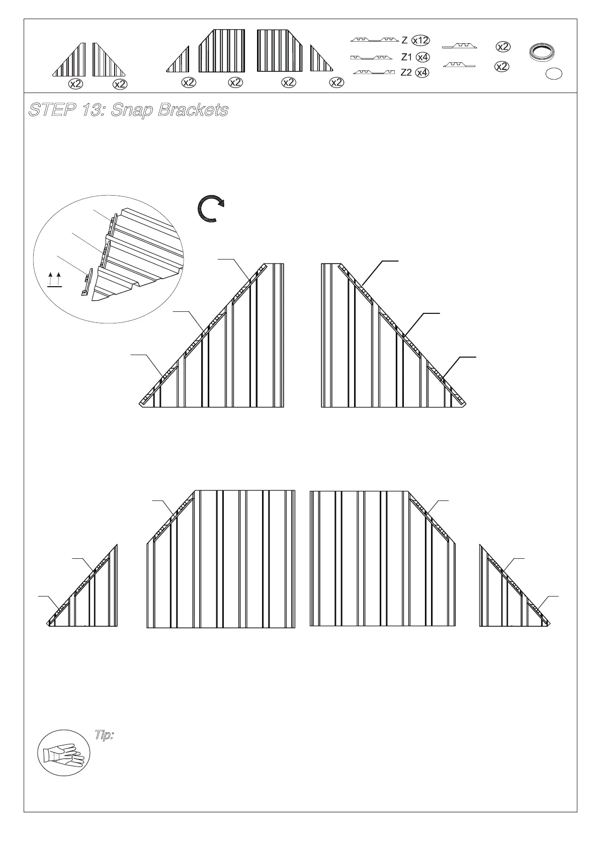 Snap Bracket (Part Z, Z1, Z2, Z3, Z4) to roof panel edges as shown in diagram.
