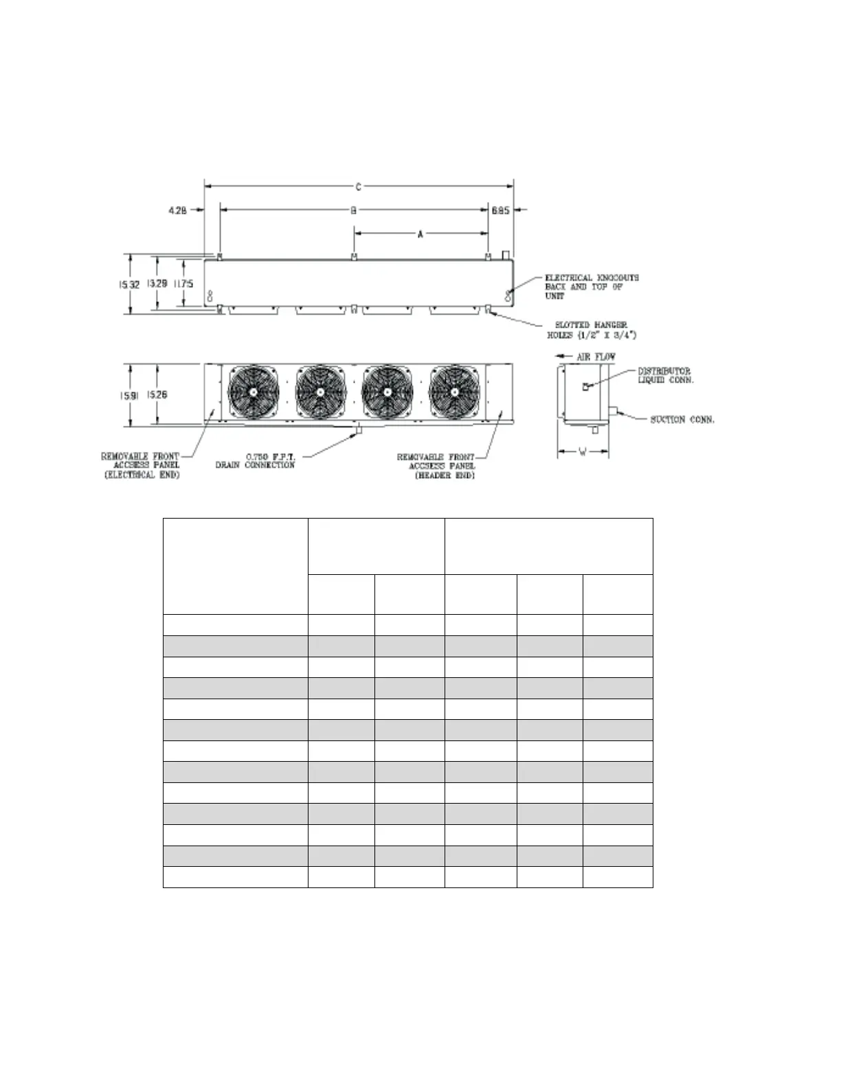 The unit cooler may be suspended with 3/8” diameter hanger rods or flush mounted to the ceiling