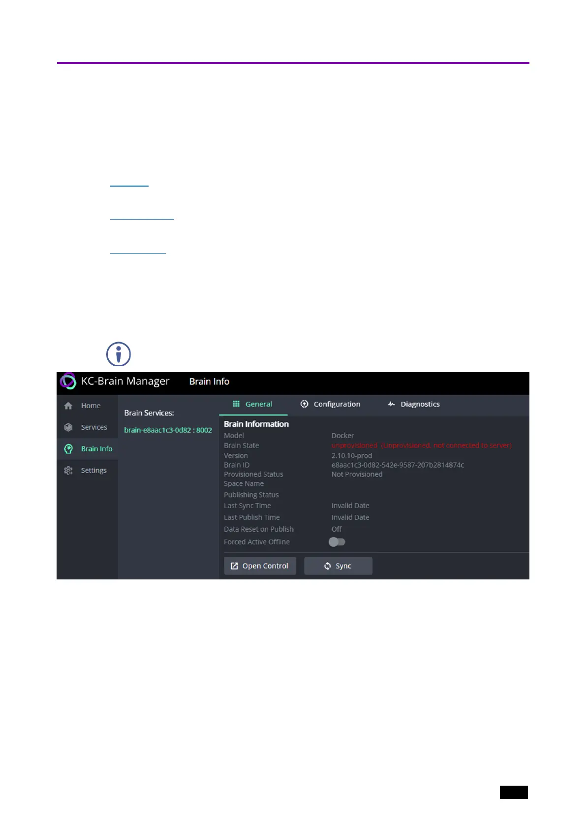 Brain Info shows Brain specific information for a user-selected Brain. Brain Info can