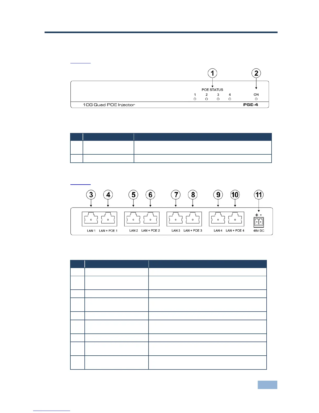 Figure 1 defines the front panel of the PSE-4 10G Quad POE Injector.