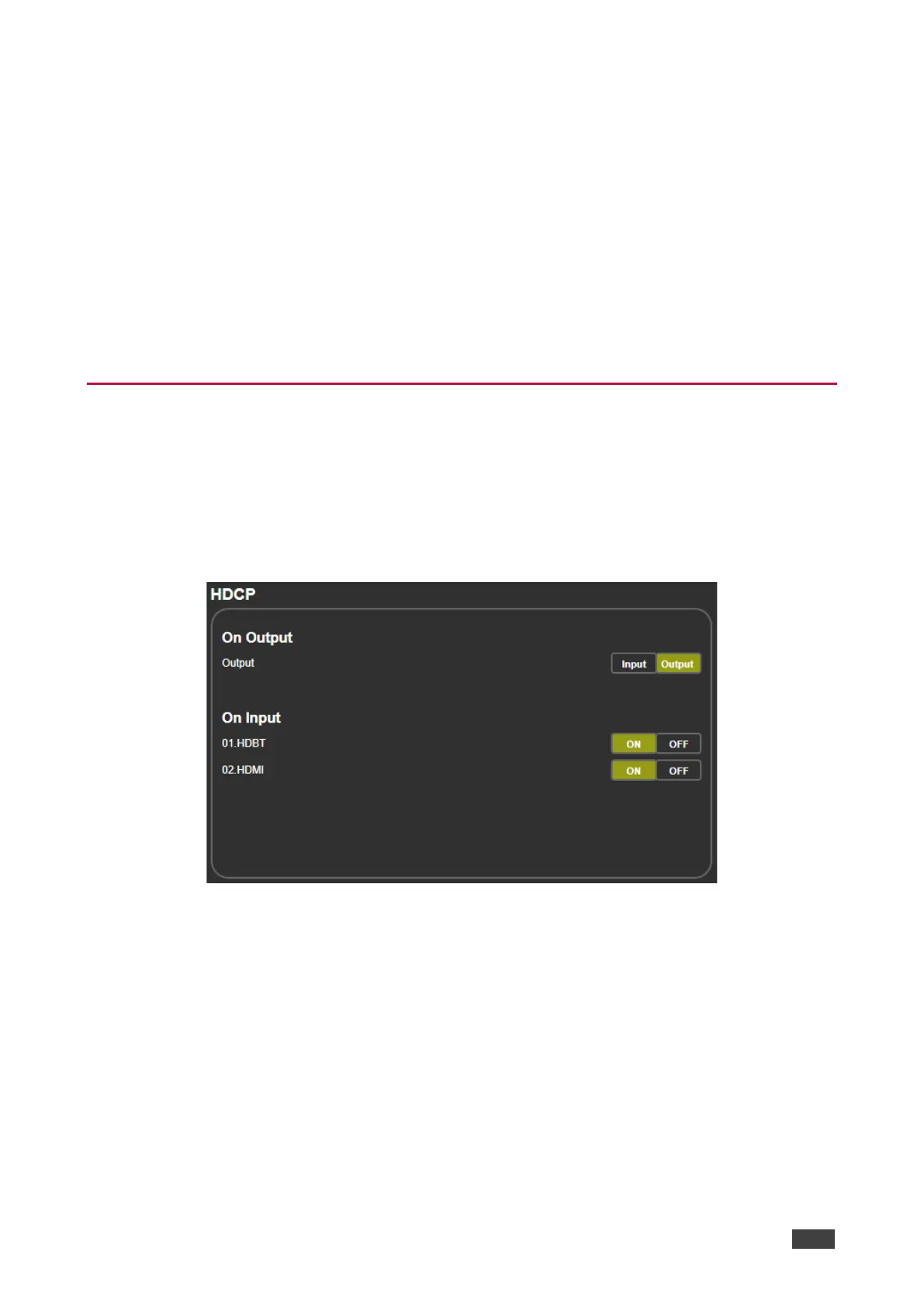 3. In the On Input area, click ON or OFF for each of the inputs to turn on or off the HDCP