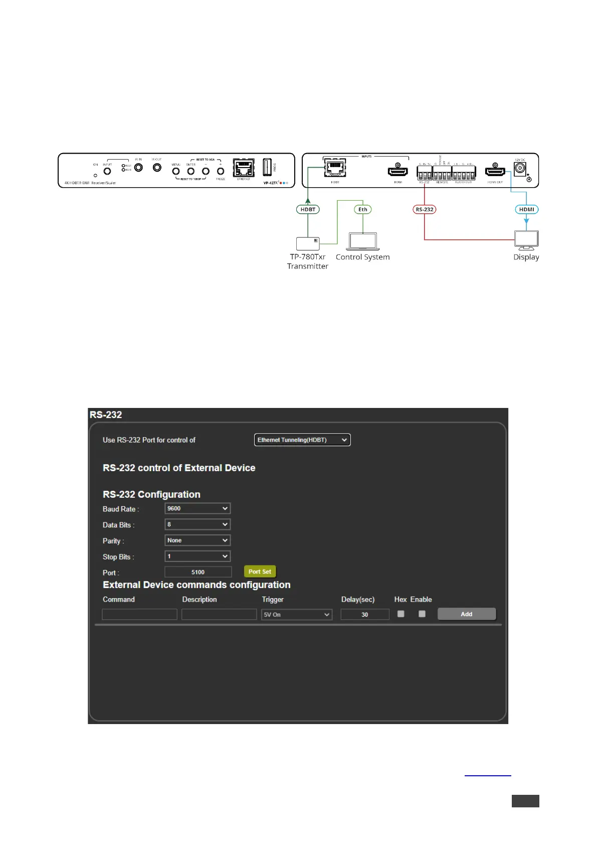 system connected to the transmitter wired to the HDBT input. RS-232 commands are sent