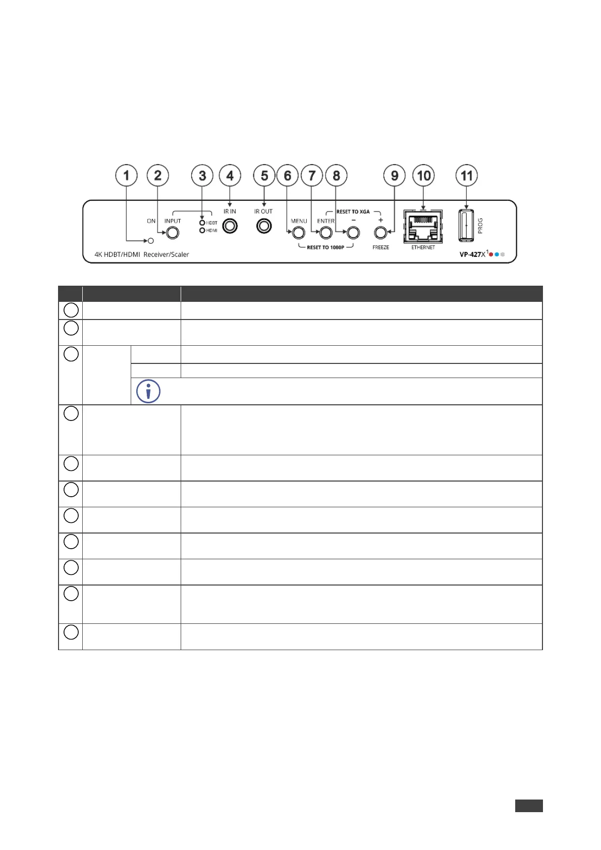 Figure 1: VP-427X1 4K HDBT/HDMI Receiver/Scaler Front Panel