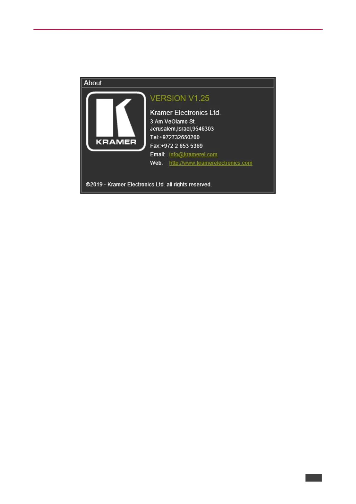 The VP-440 About page lets you view the Web page version and Kramer Electronics Ltd