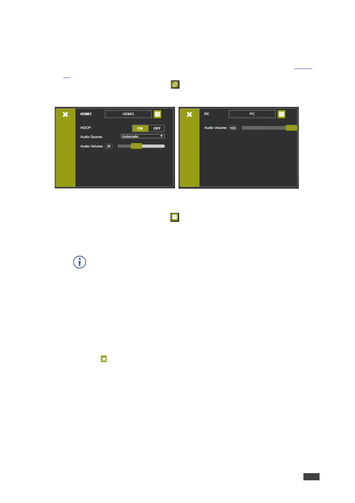 ▪ For HDMI inputs only, select an analog or embedded audio source or set input audio