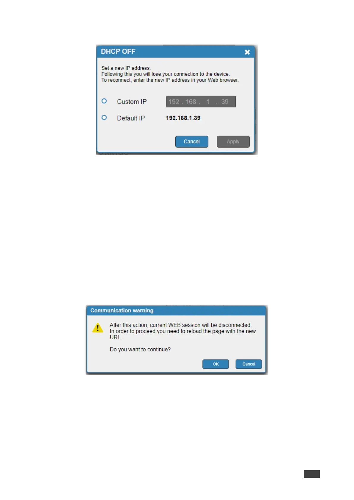 Figure 23: Communication Tab-DHCP OFF Message