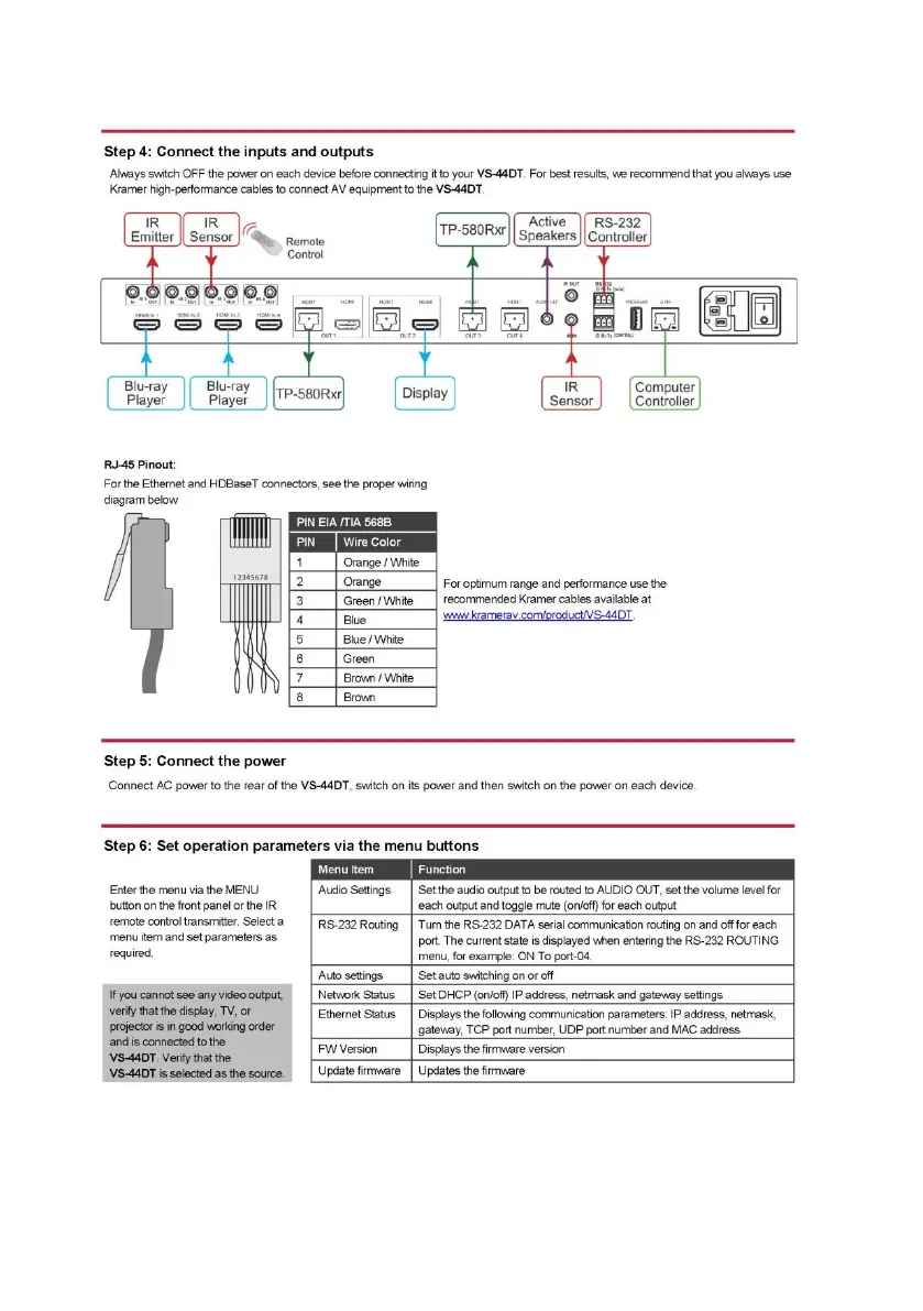 Kramer VS-44DT - VS-44 DT Operation and Setup; Connecting Inputs and Outputs; Connecting Power Supply; Setting Operation Parameters via Menu