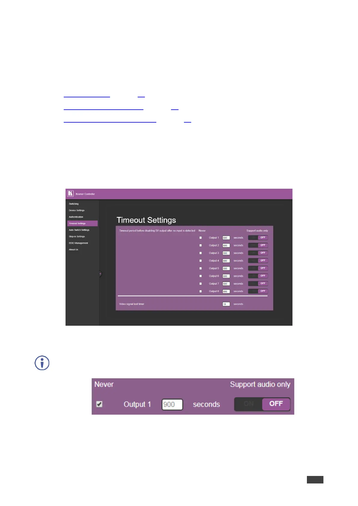 Use the Timeout Settings web page to set the time delay to shut down if no input signal is