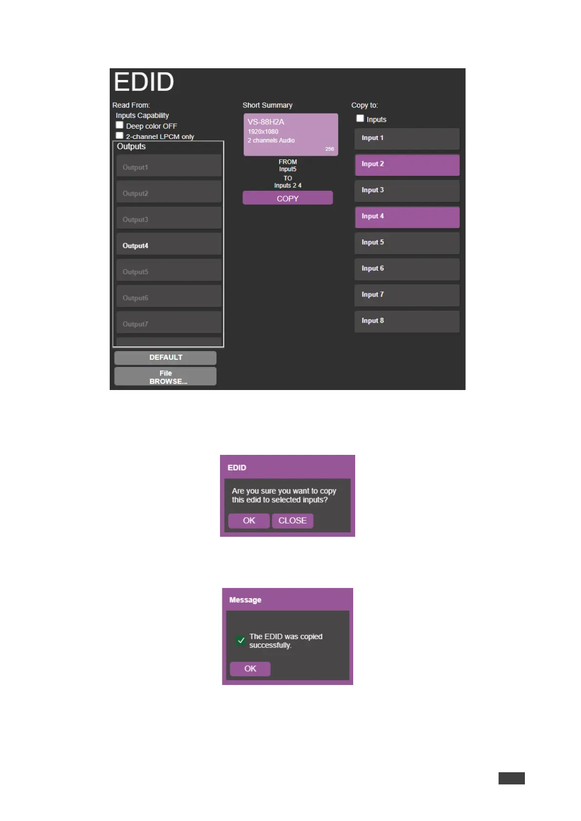 EDID is copied from a selected, connected output to the selected inputs.