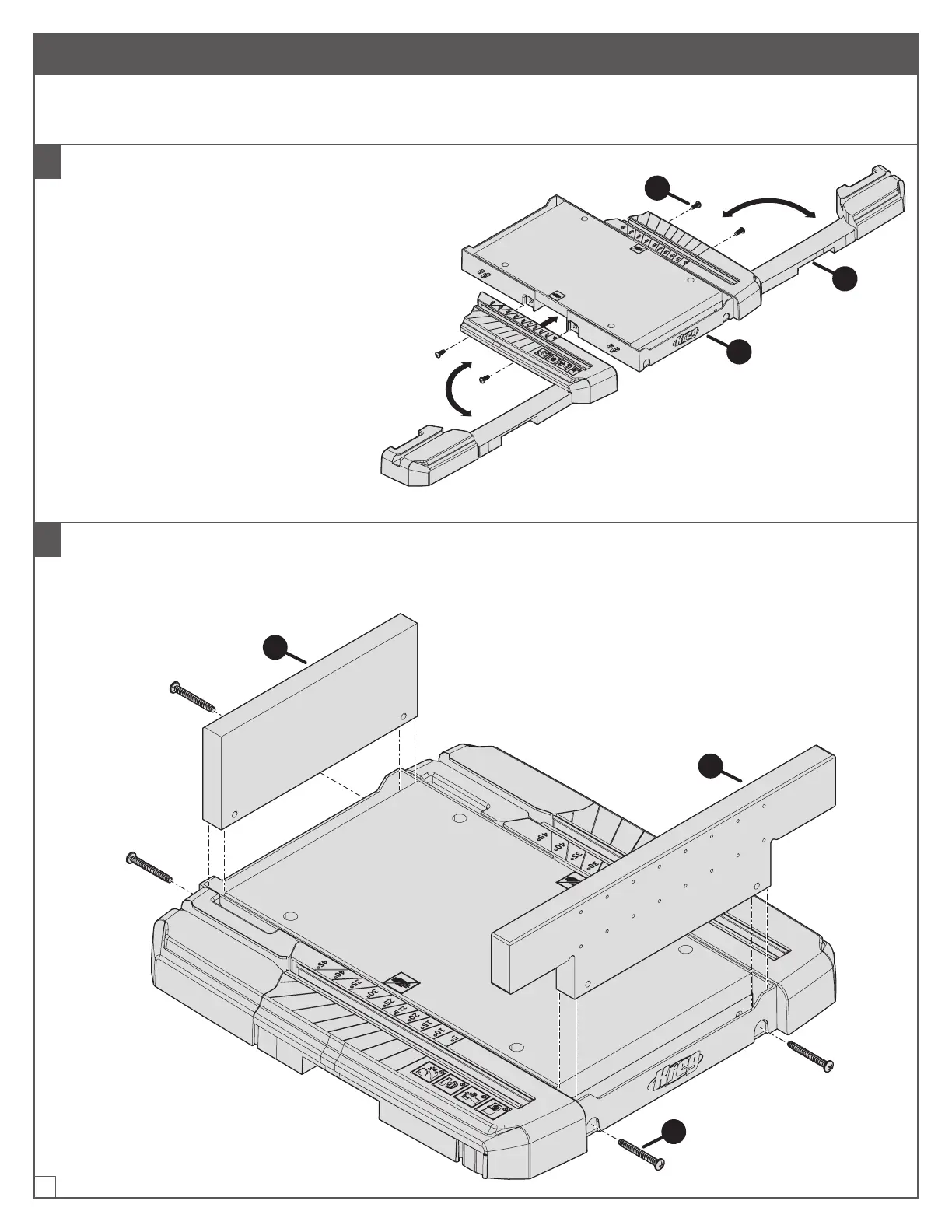 a. Fijar la placa delantera de accionamiento del protector de la hoja (H) y la placa posterior Sure-Cut™ (E) en su
