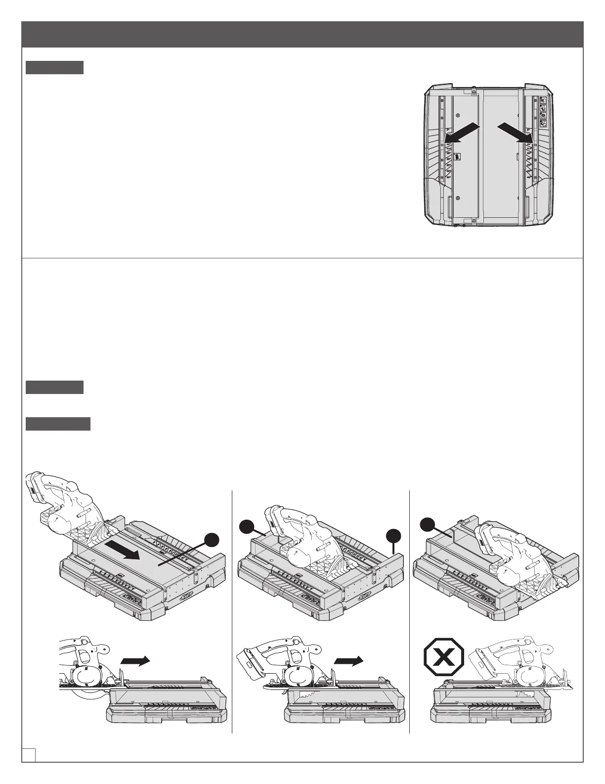 b. Align the base of your saw to the rails behind the front blade guard actuator board (H).
