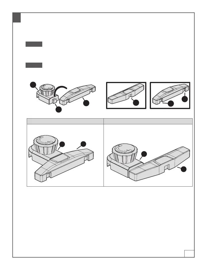 Anschlagsockel (H) nach unten schieben, bis der Arm (F) vollständig auf dem Vorsprung (1)