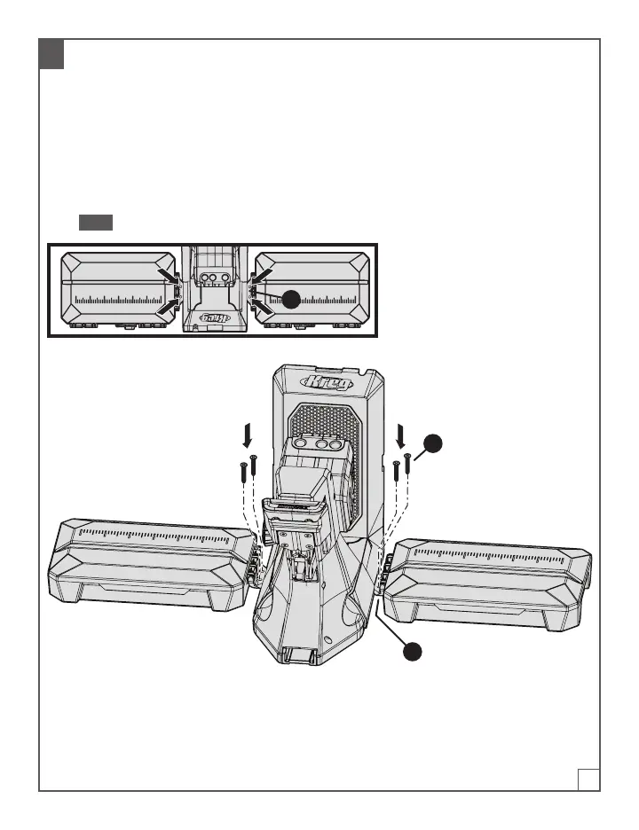 b. Inserte un tornillo para agujeros ocultos (1) Kreg a través de los cuatro oricios de montaje (2)
