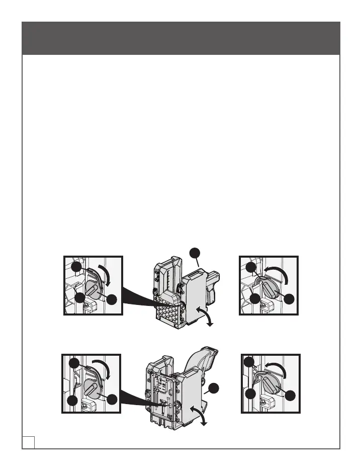 b. Rote la traba del ala (1) hacia adentro hasta que el pestillo (2) se encastre en la muesca