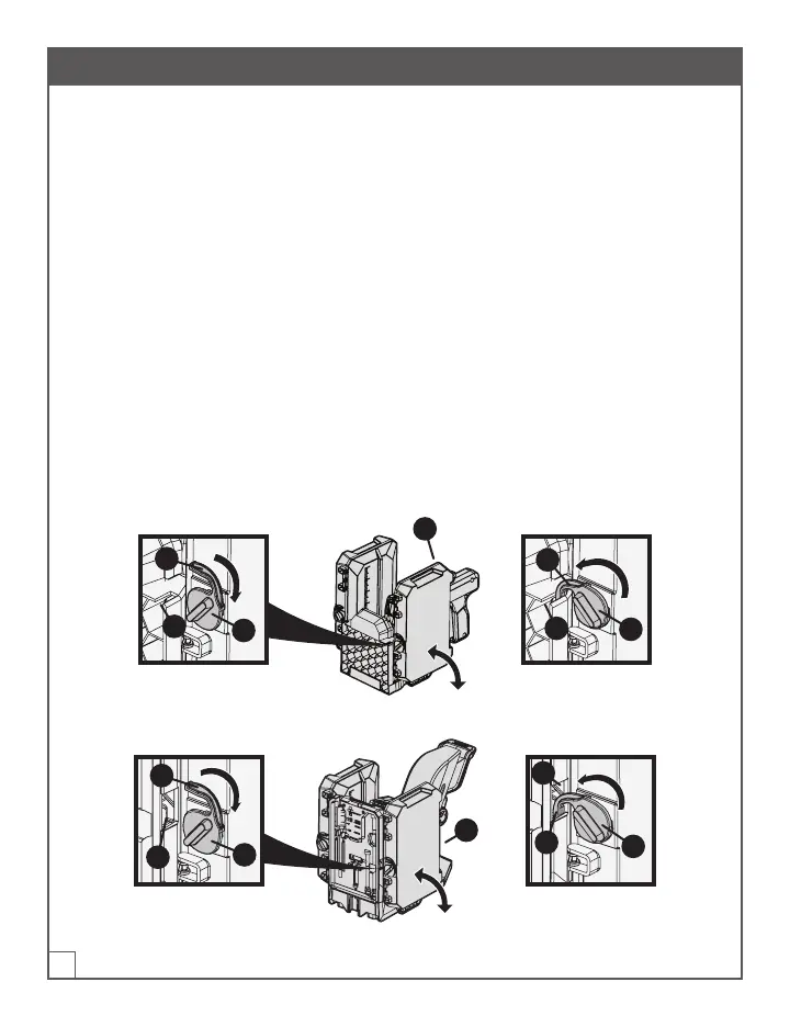 b. Girar el bloqueo de la aleta (1) hacia adentro hasta que (2) se enganche en la muesca