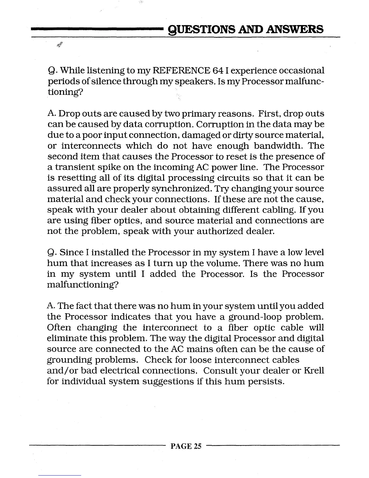 and/or bad electrical connections. Consult your dealer or Krell