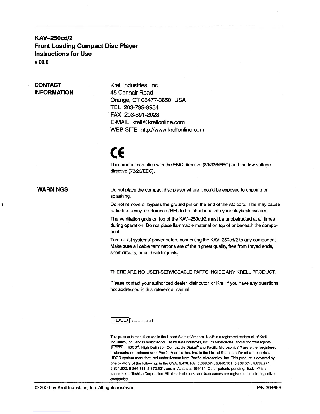 © 2000 by Krell Industries, Inc. All rights reserved P/N 304666